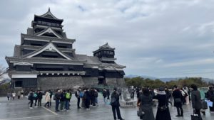 バスで島原港へ行き、フェリーで熊本港へ渡り、熊本城を見学及び震災学習。