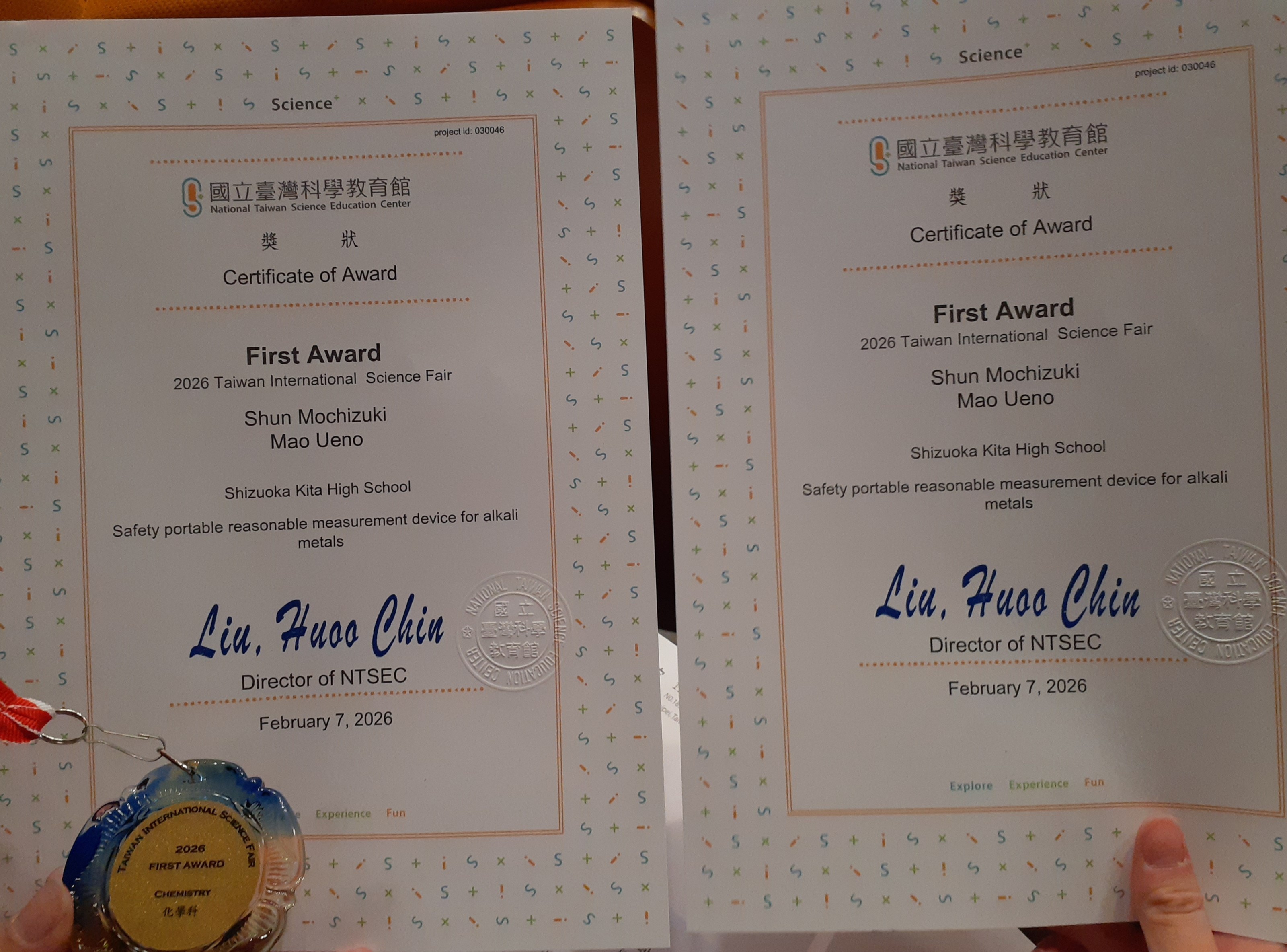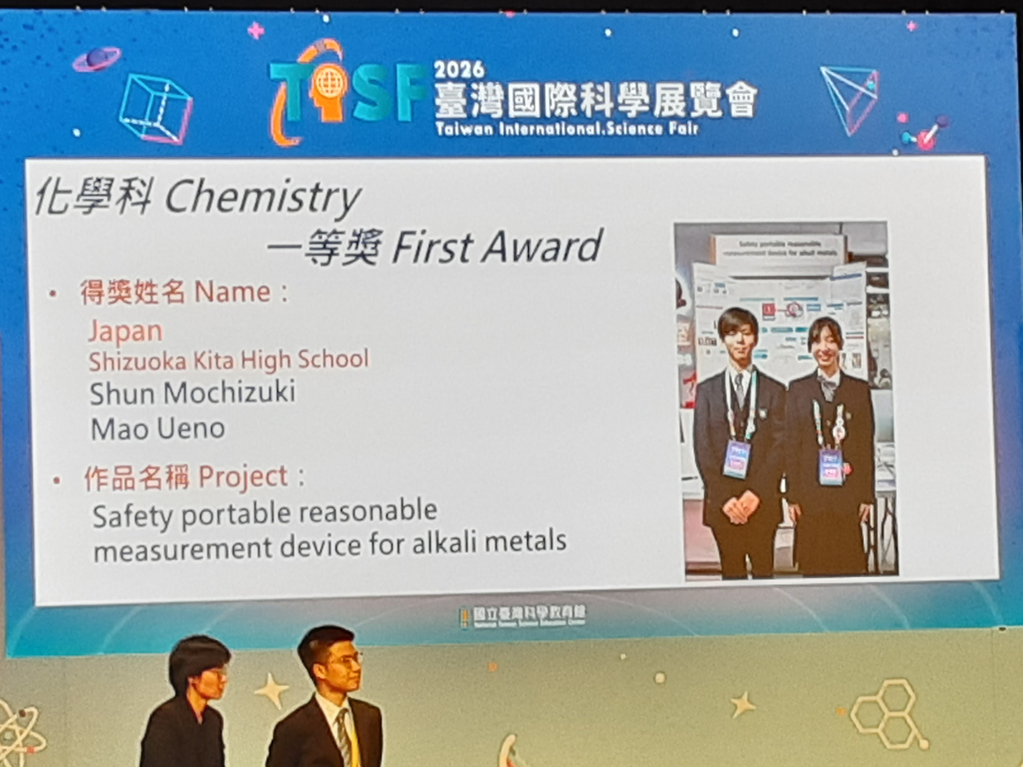 台湾で開催された台湾国際科学フェア(TISF2026)において、望月 俊くん(スーパーアドバンスコース2年)上野 真央さん(アドバンスコース2年)が化学部門に出場し、見事一等賞(First Award)🥇を受賞しました。